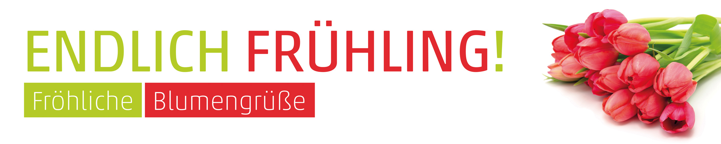 Banner mit Aufschrift „Endlich Frühling! – Fröhliche Blumengrüße“ und Tulpen (Tulipa).