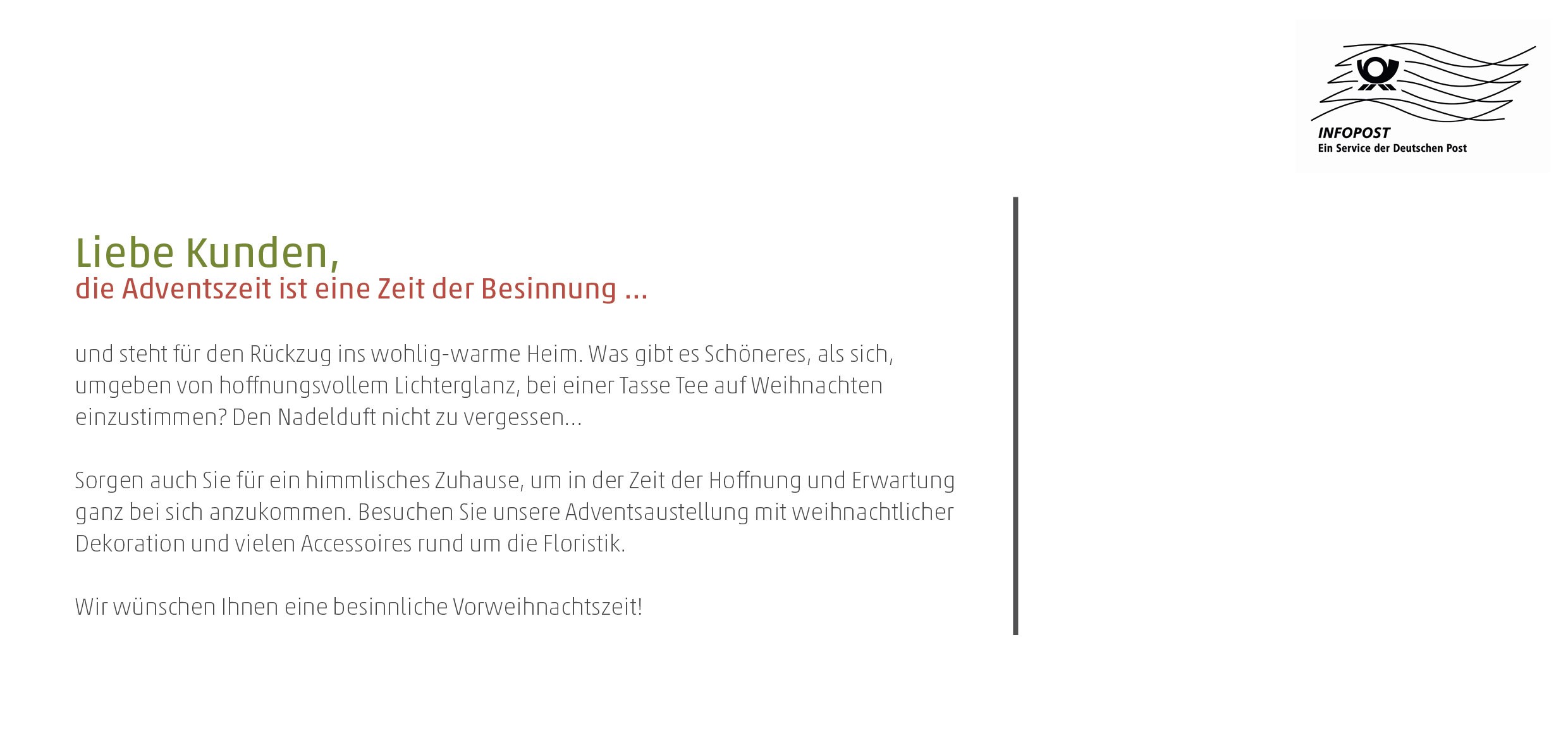 Einladung mit Weihnachtsstern (Euphorbia pulcherrima) und Aufschrift „Leuchtender Advent. Für ein feierliches Zuhause“.