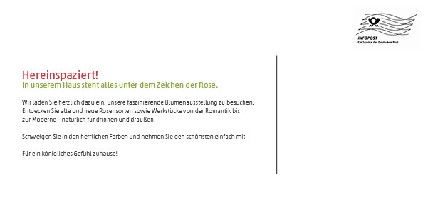 Einladung mit Rose (Rosa) und Aufschrift „Rosen Wochen. Die Königin der Blumen lässt bitten.“