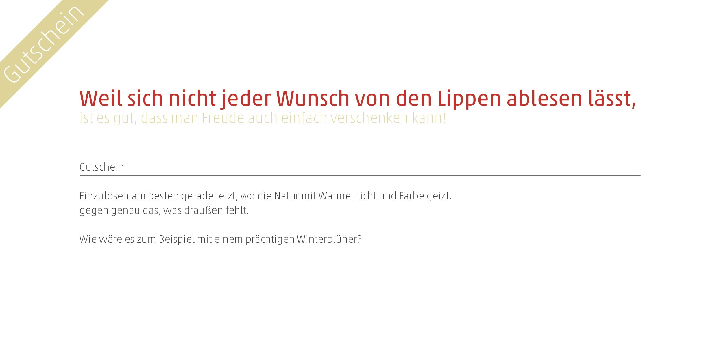 Gutschein mit Amaryllis (Amaryllidaceae) und Aufschrift „Ob rot oder weiß: Blüten im Winter“.